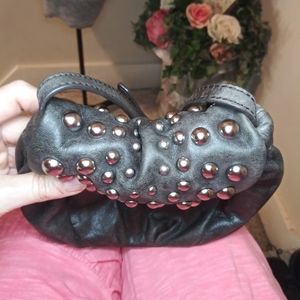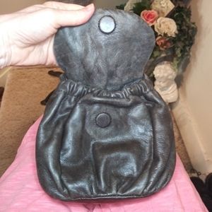 EUC Beautiful butter soft charcoal leather mini crossbody purse with a boho/rocker chic vibe from the silver studded flap, from Badgley Mischka. Purse has long adjustable leather strap, magnetic closure on flap, and silver metal and leather branded hang tag. There's a inside snap closure, so even if the flap would flip back for some reason the purse stays closed. The fabric lining is very clean with two patch pockets and metal name tag. Some faint marks, typical to the type of leather used. Great purse for a night out, vacation or when you want a cute look but don't need a big purse. I did treat this with Dr. Martens Wonder Balsam that nourishes and protects the leather. Please see all photos.