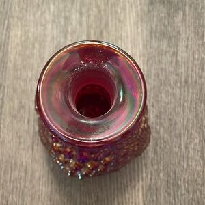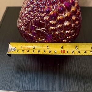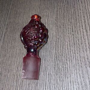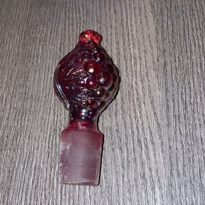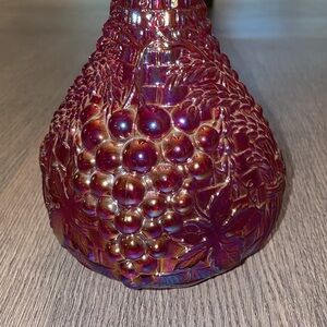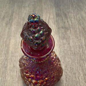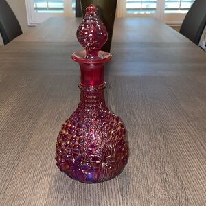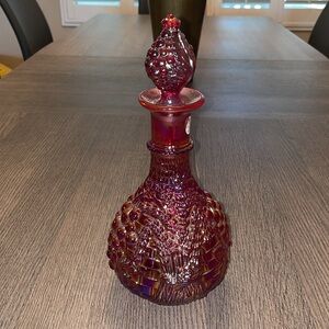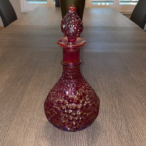 Fenton 100 years red carnival (red iridescent) glass decanter. Fall looking design around decanter. Top piece design looks like grapes and fall leaves. No chips or cracks.