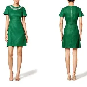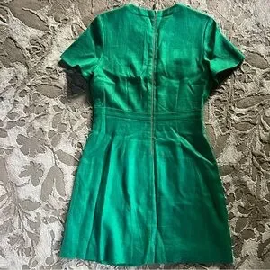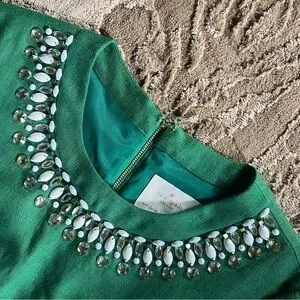 Worn once for a wedding - doesn’t fit anymore. All gemstones in collar attached as seen in photos. This is a beautiful dress- it is mainly linen so it has a bit of natural wrinkling - recommend using a steamer to remove wrinkles before wearing. This is a size 10 (size tag no longer attached) but it fits pretty small, possibly closer to an 8 us. Waist and bust measurements shown in photos above, dress is 39” long. From a smoke free home.