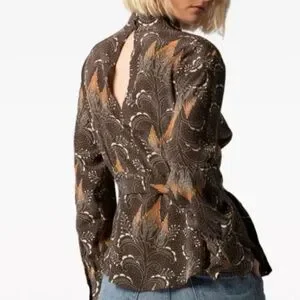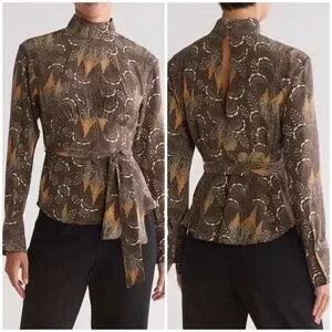 A nature-inspired print elevates a long-sleeve silk top fashioned with an elegant waist tie for contemporary appeal.
