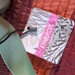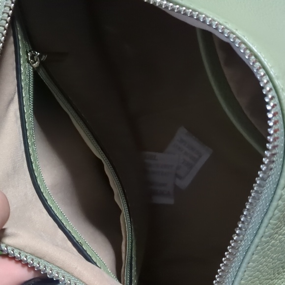 PINK STIX* sage green vegan crossbody adj. strap, dust bag zip top, 2 inside pkt, back zip pouch, strap is double sided and adjustable w/a contrasting colour. measurements in pics, NWT condition, plastic still on silvertone hardware. 2 magnetic closure end pouches, 1 on each end. A really sweet little bag, add to your wardrobe for a fun styling accessory