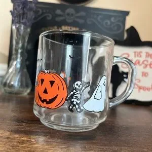 70’s Luminarc Vintage Glass Halloween Mug Trick or Treat Witch Ghost Devil Angel
