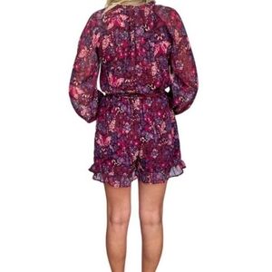 This is a rare color in this romper! Sample. So soft and beautiful! doesn't take much for this one piece to look effortlessly cool. Add some statement jewelry to dress it up, or throw on some sneakers for a more casual vibe.Features a flattering V-neck neckline, a cinchable tie waist, and ruffle short detail. Mini length romper, 100% Polyester. 18" armpit to armpit, 32"L.