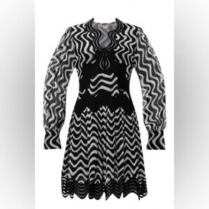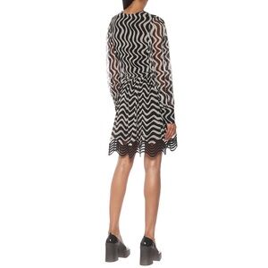 An optical masterpiece, this light-as-air silk mini dress is defined by wavy two-tone striping that runs both horizontally and vertically through the piece. Matching sheer wavy panels trim the silhouette while softly structured puff sleeves add to the lightweight feel.