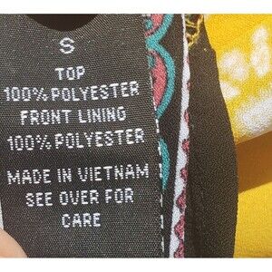 The tank top comes in a size small, with a yellow and blue multi-printed allover mandala design. The straps are spaghetti-style, and the fabric is 100% polyester. It's machine washable and easy to care for. This camisole-style top is perfect for juniors, and the slim fit makes it a classic choice for any wardrobe.