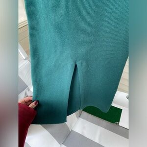 This dress is so beautiful and perfect for the holiday season! Purchased and only worn once. In “like new” condition. Pine green color that is flattering on many skin tones. Very stretchy and comfortable. Ribbed material, sheath fit, midi style. I’m 5’2”. See photo. Slit in back: 10” Pit to Pit: 27” Length: 47” 41% rayon, 31% nylon, 25% polyester, 3% spandex. Machine washable. Lay flat or hang to dry. No longer sold online.