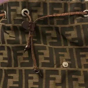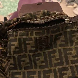 Nice clean Fendi Backpack. Very roomy, clean inside and out. Has an inside zipper pocket, drawstring closure to tighten backpack so that nothing falls out, with Leather flap that snaps over the front to cover the drawstring for an extra secure closure. Straps adjustable some peeling as seen in photos also some scratches on leather flap but that comes with the wear and use of leather but there are no tears, wholes or odor. 13”deep x 13”w