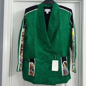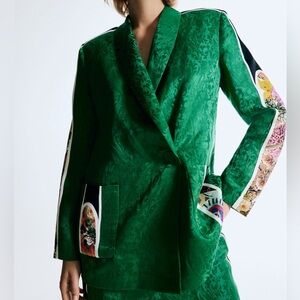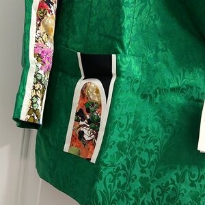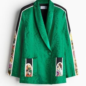 ANAMIKA KHANNA H&M. Single-breasted blazer in a lustrous jacquard weave made from a mulberry silk and linen blend. Features a shawl collar, shoulder pads and a covered button at the front. Patch front pockets. Its design also includes accent-colour satin panels on the shoulders, sleeves and pockets, the latter two with floral sections. Jacquard-weave lining featuring the designer’s logo.