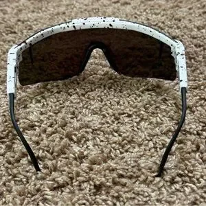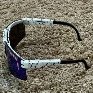 Pit Viper V2 polarized sunglasses featuring a blue reflective lens and a stylish speckled frame. These high-performance shades offer superior UV protection and come with original packaging and accessories.
