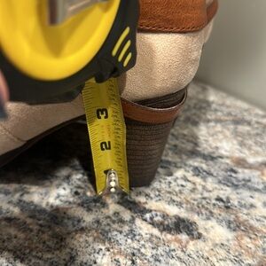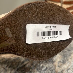Pierre Dumas size 8 1/2. Never worn booties. Cream distressed color with brown straps and lace detail. Suede. 3 inch block heel.