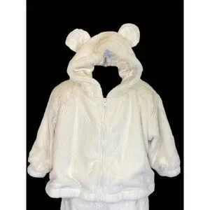 Super cute Luxe faux fur hoodie with ears and matching pants by Little Giraffe. These were discontinued several years ago. Features a front zipper and adorable hood with ears. Pants have back logo. Lined with satin.