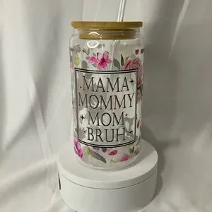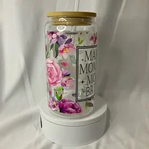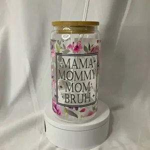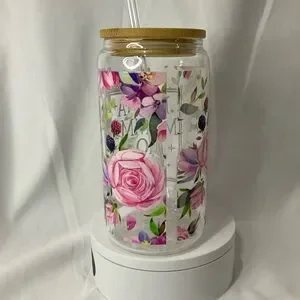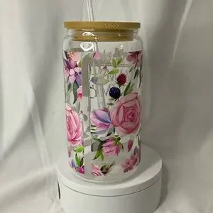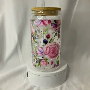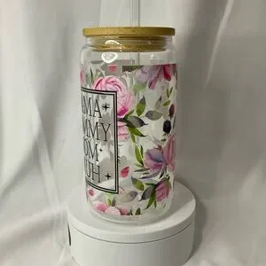 16 Ounce Handmade Clear Glass Can Cup, W/Lid & Straw, Mama Floral