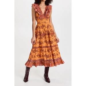 rafted from 100% cotton. Gorgeous piece boasts an enchanting Beryl Mango Print that epitomizes summertime chic. Features a flattering V-neckline and a smocked elastic bodice. Ensuring a snug yet comfortable fit. IA-line silhouette beautifully accentuates your figure. Ruffled details add a playful charm. Pull-on closure and practical on-seam hip pockets. Tie closure at the back lends an adjustable and personalized fit. Mid-weight, non-stretch fabric dress is meticulously imported and stands as a testament to superior craftsmanship. Dry clean only to maintain its pristine condition and vibrant print.