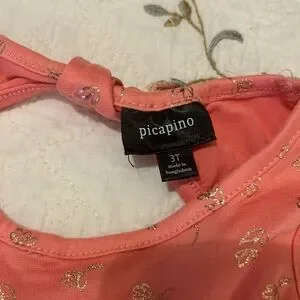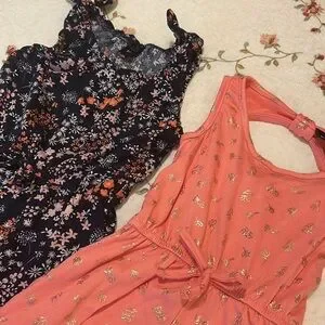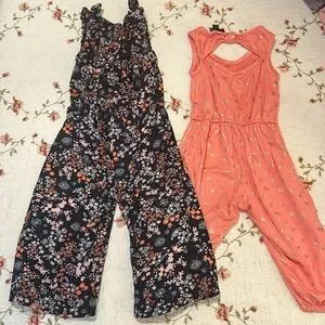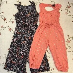 Adorable set of 2 jumpers very soft material and stretchy! Coral pink one has gold foil pattern, a cut out back and stretch leg bottoms. The navy one is a pink floral pattern wide loose leg bottoms. Both in excellent condition only wore a couple times before my lo grew out of them.