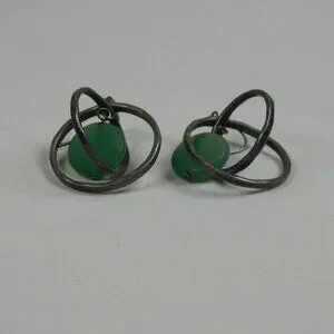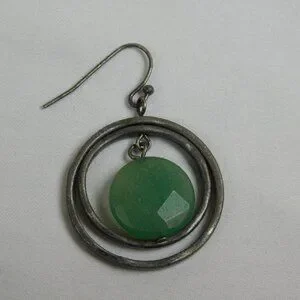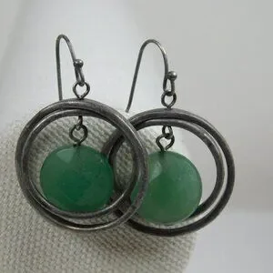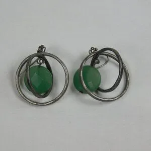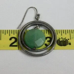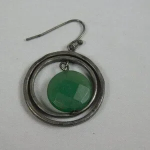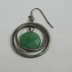 Silver Tone Double Ring Green Bead Dangle Fashion Earrings 1" Diameter Round