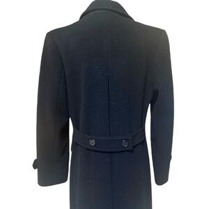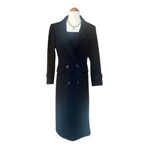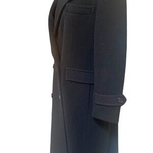 This fully lined black double breasted long wool over coat features 3 front pockets, half belt treatment on back with same treatments on cuffs and original buttons. Stored in a smoke free, pet free home and in excellent vintage condition with no flaws. Circa 1990’s.