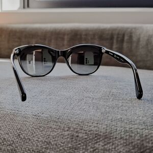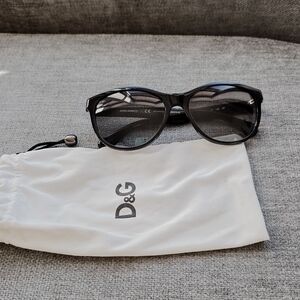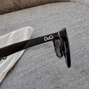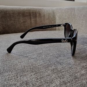 These Dolce & Gabbana sunglasses have black tinted lenses but they're not so dark that it inhibits your vision. There is a slight cat eye but not overly dramatic. The arms need an adjustment but most sunglass shops can adjust them for you. In my experience, this service has always been free. I have a low bridge, so these weren't the best style for me. If you have a low bridge, these may not be for you. Worn only a few times. Comes with the original D&G sunglasses pouch.