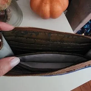 Large couch wristlet in good pre-owned condition. lots of compartments for cash and cards. exterior is fine as pictured there is peeling on the inside as pictured. Please see all the pictures.