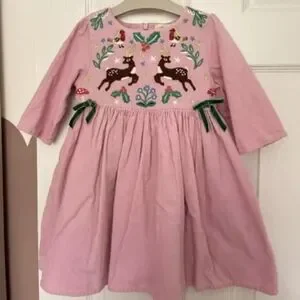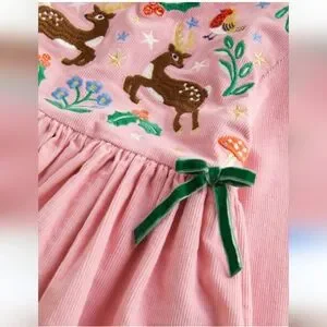 Christmas parties call for a standout outfit and this pink reindeer cord embroidered dress is the perfect combination of cosy and whimsical.