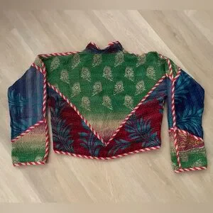 Size small - Quilted Jacket with vintage Kantha fabric. each jacket is unique with different fabrics used for each. There are front pockets on one side of jacket. The jacket is reversible with unique fabrics on each side