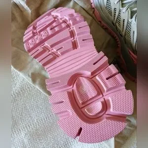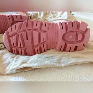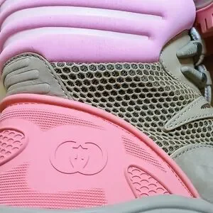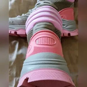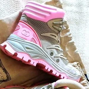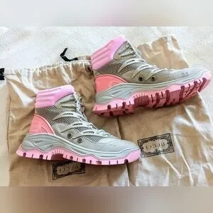 no tags. Gucci lightweight pink leather. fabric and thick rubber sole with ankle height lace up. pink, coral, beige, khaki colors. made in italy