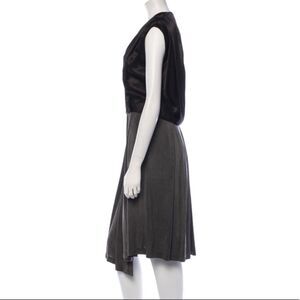 Grey and black VPL midi A-line dress with slit at front, surplice neckline and concealed zip closure at side. Size not listed, estimated from Measurements Approx. : Bust 38”, Waist 32”, Hip 42”, Length 42”