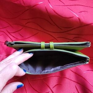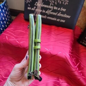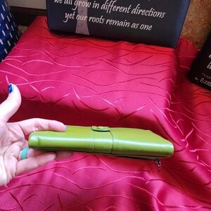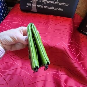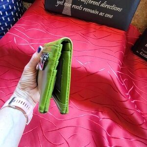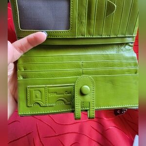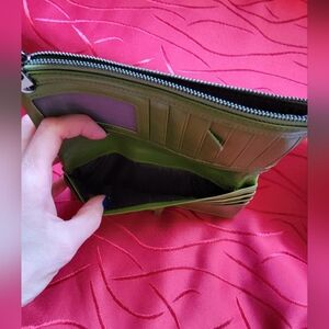 Green Leather wallet with a lot of card slots, zippered areas, and mesh ID card slot. New in original sleeve. I only took it out for the photos. It does not have tags, so I am unsure of the brand. It looks brighter in color in the images. It really is a softer Olive green color. Most phones would fit in between the two areas since it snaps shut with a leather strap. #Green #Leather #Wallet #CoinPurse #Fall #Winter #Spring #Summer #Checkbookholder #Soft #Zippy #Snappy