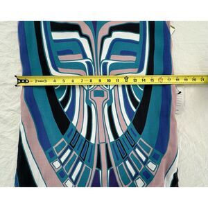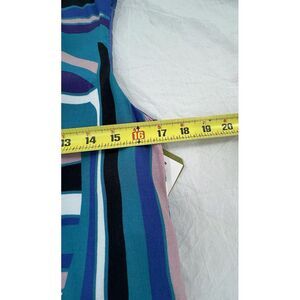 This Nicole Miller Artelier dress is a stunning addition to any wardrobe. The blue geometric print is eye-catching and the sleeveless design is perfect for warm weather. The dress has a round neckline and a zip closure for easy wear.