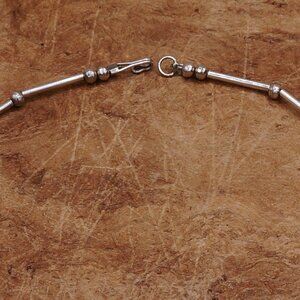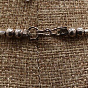 This necklace is a statement piece that will add a touch of ethnic and regional style to any outfit. It is handmade and stackable, with a length of 17 inches. The pendant shape and beading is reminiscent of the Carlos Diaz style, yet the necklace is only hallmarked STERLING.