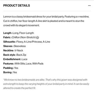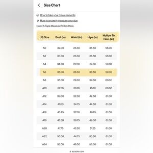 The Azazie size chart told me to order a A10 based on hips and then have it altered. I ordered an A6 and it fit like a glove except was large in the bust and the shoulder straps were too long. I safety pinned the straps in a pinch the day of the wedding and it fit fine. The dress touched the floor while barefoot. Dress was worn for 3 hours and has no alterations, stains, or issues.