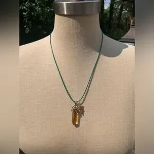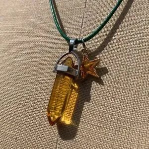 Handmade Honey Amber Resin Crystal Amulet Necklace & Honey Yellow/Gold Metal Enamel Star Charm on a green colored cord.