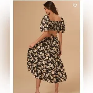 This floral midi dress stuns with dramatic puff sleeves and a flattering low-cut back. It’s a standout choice for Summer weddings, and layered under a denim jacket will make it a cozy piece for Fall.