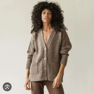 A customer favorite returns to the Andean Highland Wool Collection. We love this yarn for its exceptional soft hand feel and for the structure it brings to our knits this season. Styled with a wide bulky stitch, front pockets, and button down for cold days ahead.