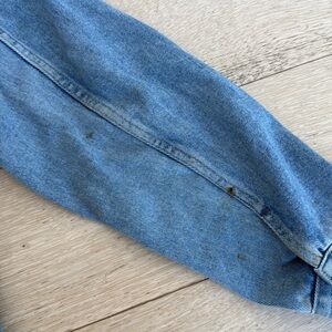 This iconic jacket is timeless and cool. Very boxy comfortable fit. Has two very small and unnoticeable imperfections- see last pics. Can probably get stains out in dry cleaning.