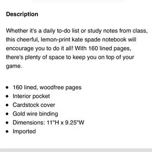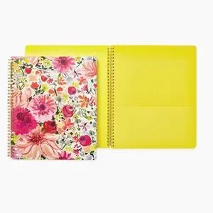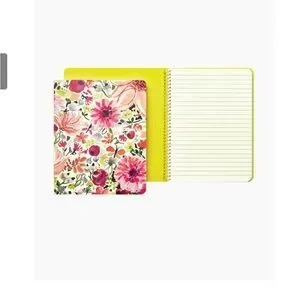160 lined pages, gold spiral with interior pocket. Disposable plastic cover has a tear.