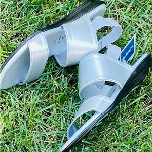 NWT Women Sz-6.5 ITALIAN SHOEMAKERS- Silver Flats Open Toe & Elastic Heal Straps