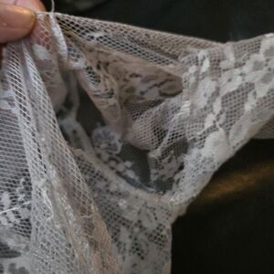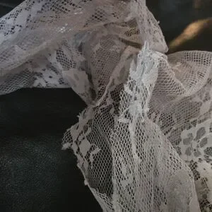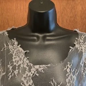 This is a beautiful stretchy light gray all lace vintage dress by Cloe. This feminine piece has deliberate raw edges and deliberately open arm pits. This is a beautiful light blue gray colored lace with a wide neckline, long sleeves and a fringe, raw hemline and lots of stretch. This is a prototype sample I received from the designer while working on a film. Due to its length, I think it would be considered a mini dress size medium.