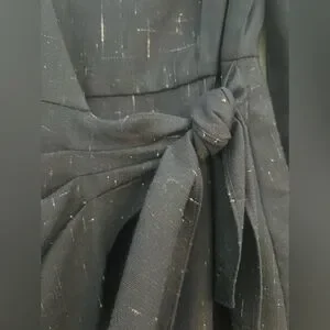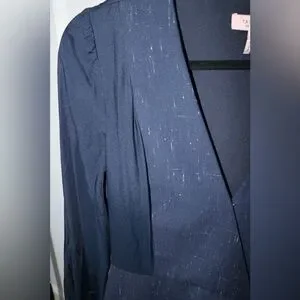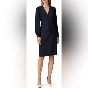 Navy wool (Shell: 50% Virgin Wool, 31% Viscose,17% Polyester, 1% Spandex,1% Polyamide Combo: 55% Silk, 45% Viscose Lining: 100% Polyester). Wrap dress. Long sleeves. V-neckline.