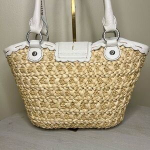This stylish Brighton woven bag features a floral accent, sturdy handles, and a decorative charm.