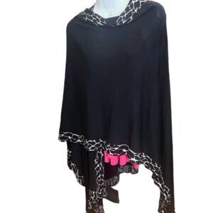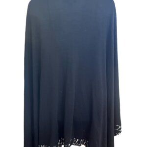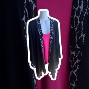 Dramatic - beautifully transitions from open shawl to sophisticated wrap. Medium to lightweight, this wrap will be your favorite go-to for an evening out on the town. Black with zebra design trim. O/S - shortest length at back is 31," longest point is 42." Pre-owned in excellent condition.