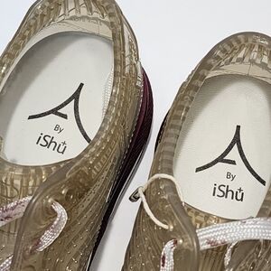Made entirely of rubber, PVC and TPU - a technical and innovative polymer - it is equipped with a special one-way valve inserted in the heel that allows the escape of air and humidity (thereby avoiding condensation) but prevents the entry of water. The AirDP sneakers by Ishu+ are the first shoe in the world covered by an international patent, in completely breathable plastic materials. Model: SAND SATURN. Size 40: insole 25.5 cm.