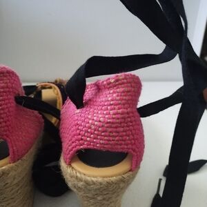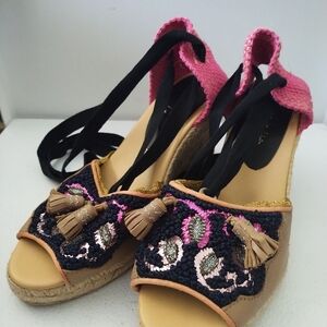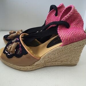 MEHER KAKALIA SHOES THAT'S ARE WEDGES, COLOR BLACK,PINK,TAN, TASSELS ON THE FRONT OF THE SHOES AS WELL AS ESPADRILLES, RIBBON THAT WRAPS AROUND THE ANKLE, LEATHER EDGES AND IN THE INSIDE. A MUST HAVE.