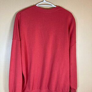 This Twik by Simons sweatshirt, in size Medium, features a captivating Mona Lisa decal on the front. Made of 80% cotton and 20% polyester, it comes in a stylish raspberry color with cuff sleeves. Trendy and comfortable, it's a perfect addition to your wardrobe. P2P is approximately 27 inches.