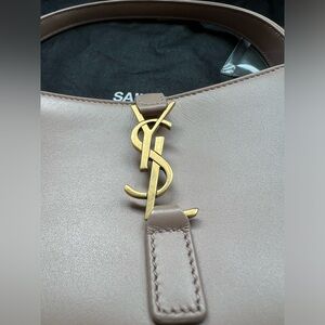 This is an authentic SAINT LAURENT Smooth Calfskin Le 5 A 7 Hobo in dark beige. This elegant shoulder bag is crafted of smooth calfskin leather in tan / beige. The bag features shoulder strap. The front features a gold prominent YSL monogram cross strap that opens to a beige suede leather interior with a small pocket.