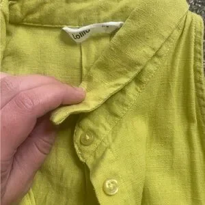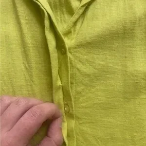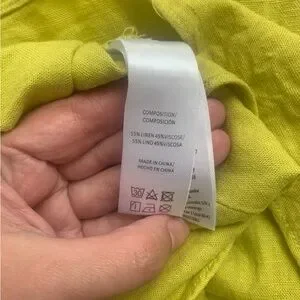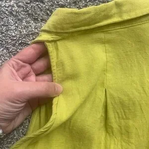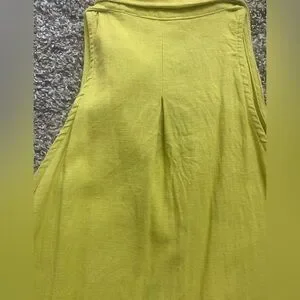 Linen and viscose in a Citron color. The buttons down the front are covered by a panel of fabric, with pleated detail in the back and small overlap at the top of the shoulder. Gorgeous to show off tan shoulders in the warmer months!