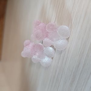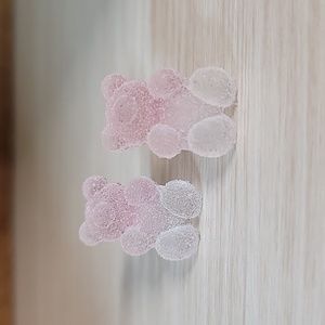 Gradient colored sugar-effect realistic looking gummies on hypoallergenic posts.