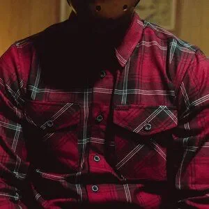 Men’s red, black, gray, and white plaid patterned flannel shirt