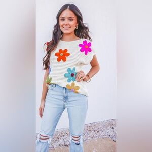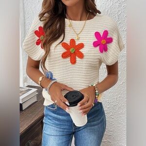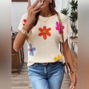 NEW Crochet Floral Cap Sleeve Sweater Knit Short Sleeves Sweater