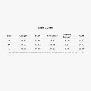 L:Bust:44.9IN,Cuff:15.6IN,Length:24.6IN,Shoulder:27.2IN,S