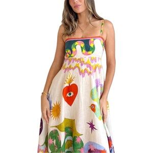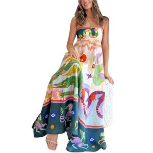 Boho Print Spaghetti Strap Dress. Elegant and edgy! Dragons, snakes, and hearts oh my! Adjustable spaghetti straps, square neck line, a-line maxi dress flows effortlessly over the hips. Empire waist adds a touch of elegance, side on-seam pockets, and stretchy smocking across the back panel provides e a flattering fit. Brand new without tags. Never worn. Bust 34, lengthy 43.5